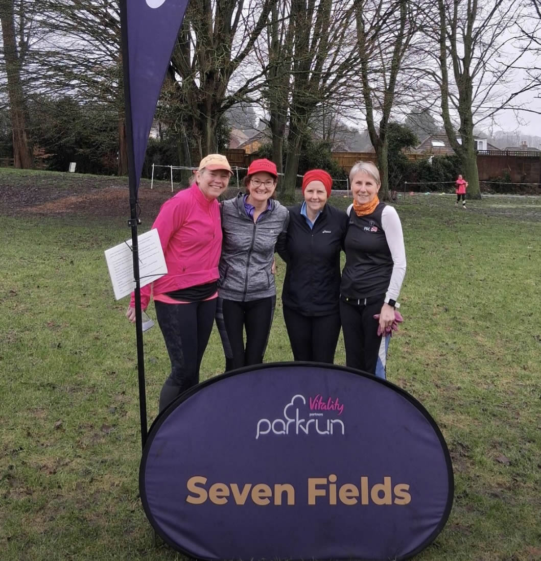Linda (3rd from left) and Liz (far right) at Seven Fields Parkrun - 7th February 2026.